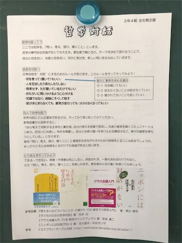 明日は文化祭です。 名南工業高校3年4組で哲学対話を行います。 午前の部は10:00から 午後の部は12:30から行います。 質問ゲームをして、 テーマ決めして、 対話します。 1時間半ほどを予定しています。 地域の方は受付を通ってご参加頂けます^_^